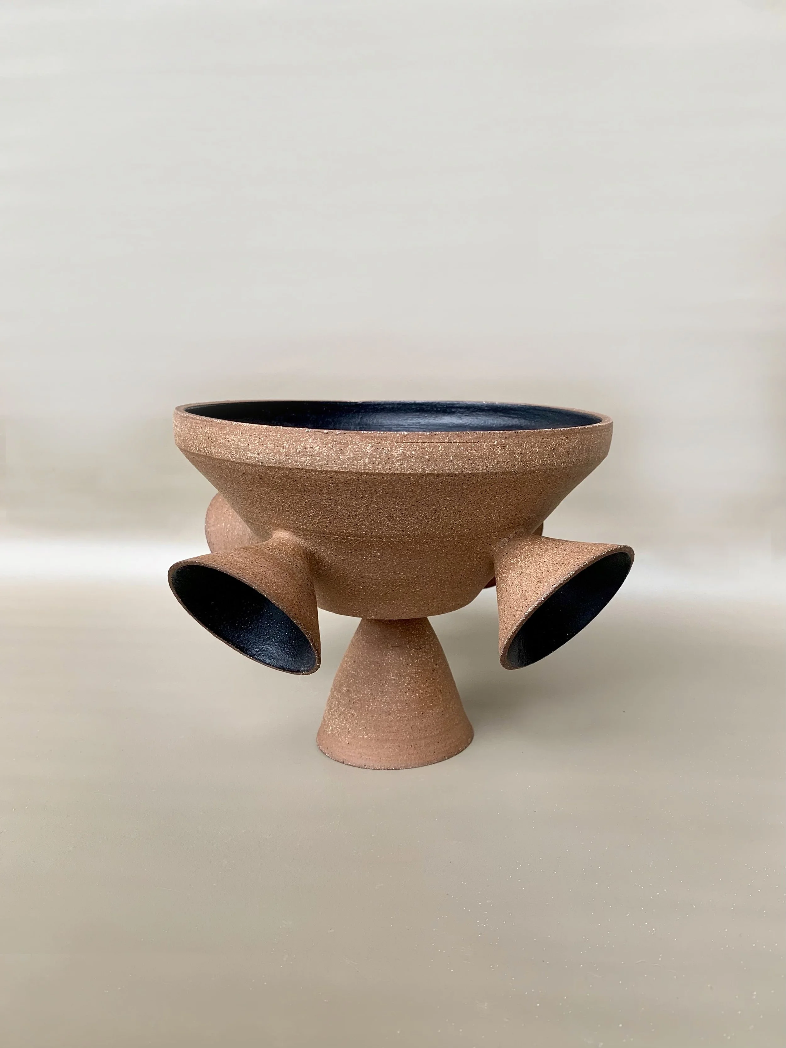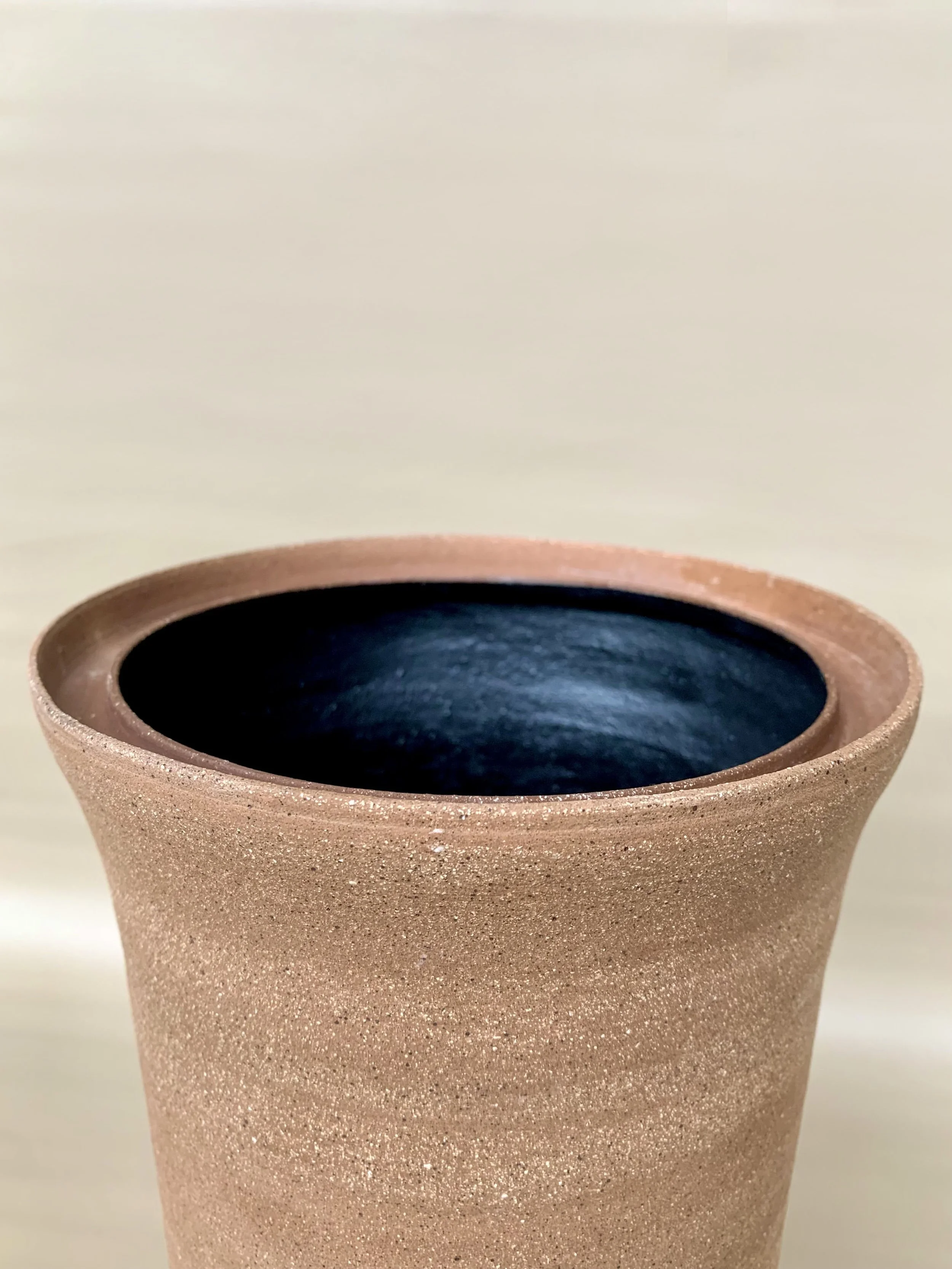 The form is wheel-thrown using brown stoneware clay and glazed with a matte black exterior and clear interior. It is both suitable for food and non-food items.