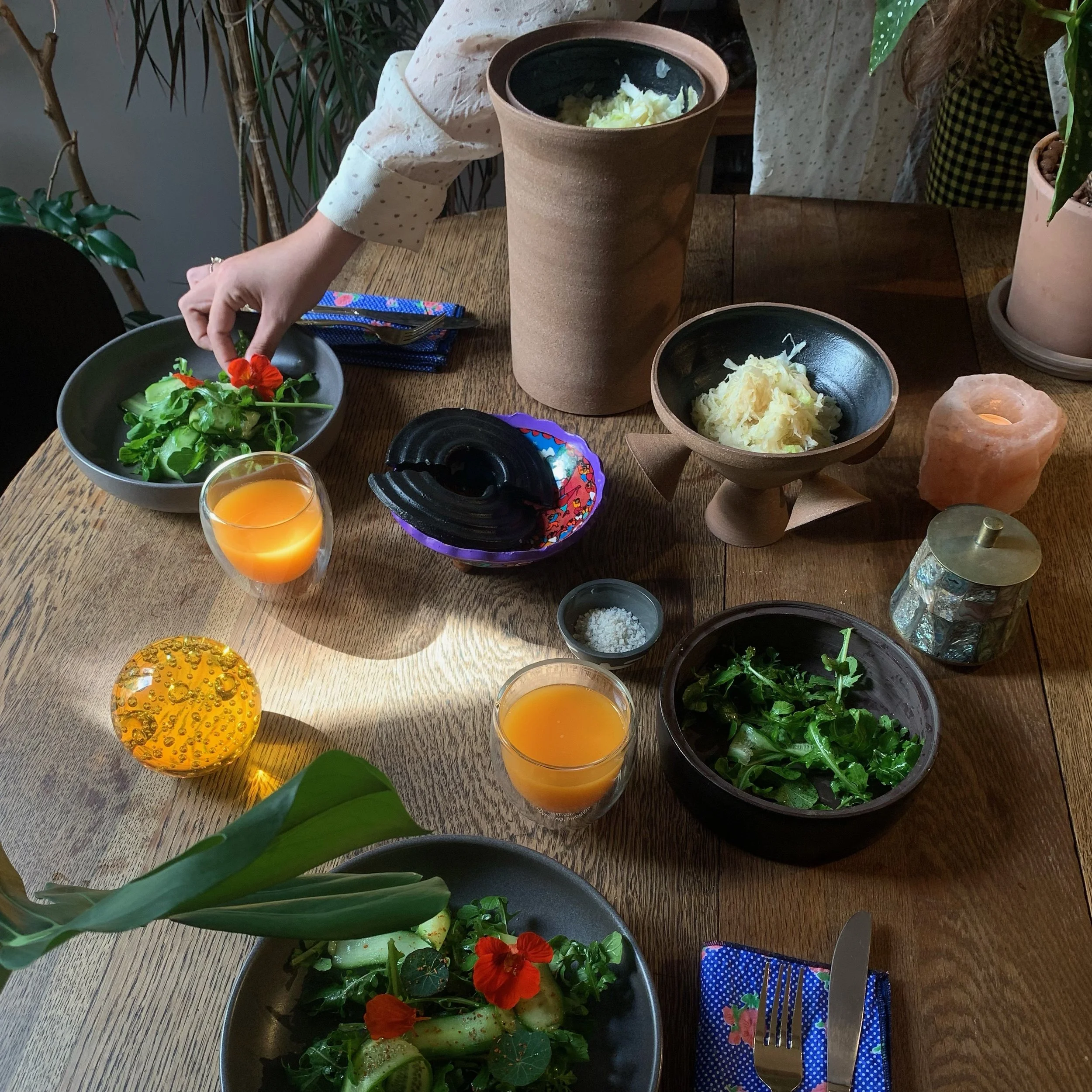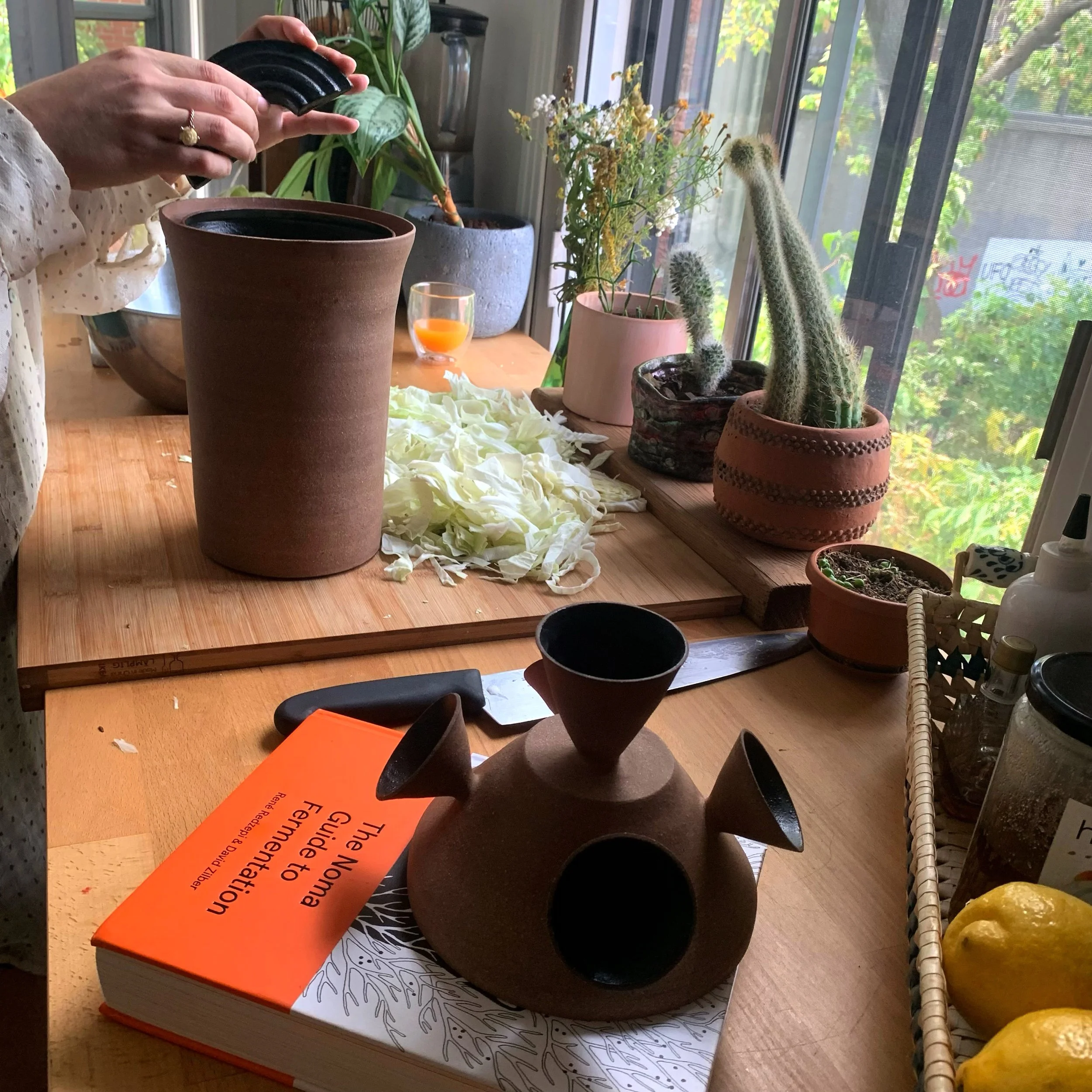 The horned lid is inspired by the fungi trompette de la mort, a delicious mushroom (and indeed not deadly like its name might suggest) whose black trumpet-like bodies pop from the earth during the August- October months. The top trumpet also makes a nice salt dish as you prepare your fermentation recipe.